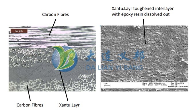 確切的說,Xantu.Layr 不是復合材料中纖維增強的物質(zhì),而是作為樹脂的增強劑。例如:代替樹脂中使用的增強顆粒,Xantu.Layr可以作為樹脂韌性增強物質(zhì)放置于每一層預浸料或者增強纖維之間。